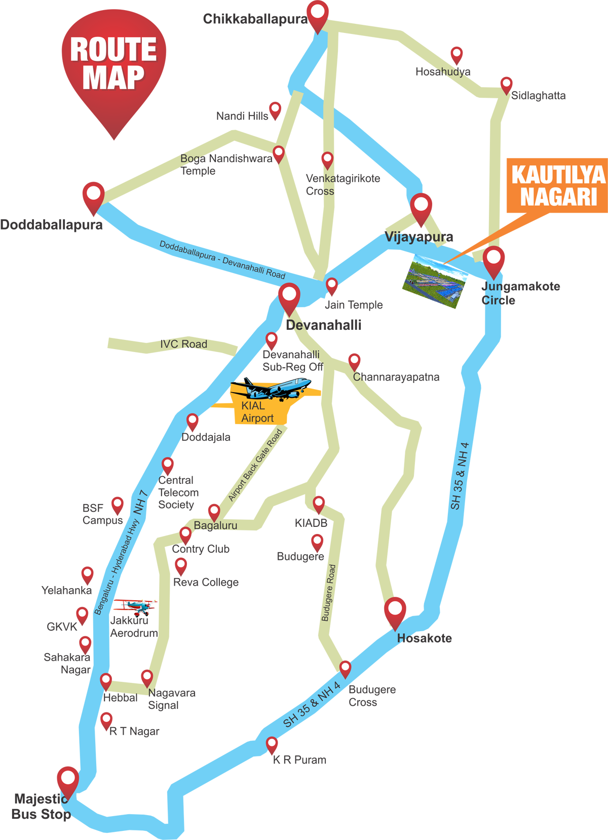 Dream Project All companies have dreams and we have dreams too. We would like to share this dream of ours with you. Our dream is to build a massive Integrated Township which shall include villa plots, villas, row houses, apartments, commercial & entertainment complexes, IT Parks, educational institutions, hospitals, world class sporting facilities, clubhouses with the modern facilities etc. We want this project to take off as soon as possible because we want you to enjoy the best we can offer with our dedicated team who are working hard to “MAKE IT POSSIBLE” for you and your loved ones. This project shall be a one stop destination for all your needs. The project location is near Devanahalli – Vijayapura abutting our ongoing project “Kautilya Nagari”.